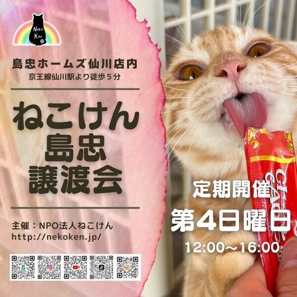 | イベント内容 | ペットとしてではなく、生涯家族として猫を迎えて下さる方への譲渡となります。 原則『譲渡会』にて正式なお申込みを承っております。 譲渡会には家族を待っている猫さん達がたくさん参加します♪ ▽▲ねこけん定期譲渡会▲▽ ★毎月第4日曜日は島忠ホームズ仙川店にて開催★ [時間] 12:00〜16:00 [会場] 島忠ホームズ仙川店 〒182-0003 東京都調布市若葉町2-1-7 https://www.shimachu.co.jp/gmshop/tokyo/313.html [交通] ・京王線「仙川駅」より徒歩約5分 ※事前のご予約は必要ございません。ご家族皆様でお越し下さい。 ※混雑時は整理券をお配りし、お待ちいただく場合がございます。 ※屋内での開催となり雨天決行です。 ※猫ちゃんたちとのふれあいはできません。 --- ◆必ずお守り頂く事◆ ①終生飼養 ②完全室内飼養 ③年1回のご報告 ④ペット飼育可能な物件にお住まいであること ただし、以下の該当の方は、譲渡出来ない場合がございます。 ※学生、安定的な収入のない方 ※60歳以上の方は、成猫さんを家族に迎え入れることが出来ます。 里親様のご年齢に応じた成猫の譲渡となりますのでご相談ください。 ◆譲渡費用について◆ 不妊去勢手術・医療費の一部負担をお願いしております。 お届けエリアによっては往復高速料金(実費)を別途ご負担いただく場合がございます。 なお、交通費に関しましては正式譲渡に至らない場合であってもご返却できませんので予めご了承下さい。 ・ご希望の猫さんと家族になるまでの流れ ・譲渡時にかかる一部ご負担金などの詳細 ・譲渡契約書のサンプル等 下記URLに掲載しておりますのでご確認ください。 https://nekoken.jp/jotokai/joto-nagare/ https://nekoken.jp/jotokai/joutokibou/ ◆引き渡し方法◆ 1週間程度のトライアルの後、正式譲渡となります。 必ずご自宅までお届けします。 ◆お届け可能エリアについて◆ 応募可能エリア内であっても、遠方の場合アフターフォローの関係上お断りさせていただくことがございます。 ご心配な際は、前もって市区町村名や最寄り駅等をメールにてお問い合わせいただけますと幸いです。 お手数をおかけいたしますが、何卒ご了承くださいますようお願いいします。 ※譲渡会日程がご予定と合わず個別お見合いご希望の方は、各募集サイトからのご応募 もしくは下記連絡先までお問い合わせください。 ※猫さんの性格や体質により譲渡会に参加することが困難な子もいます。 気になる猫さんの譲渡会への参加情報などは、個別にお問い合わせください。 [連絡先] ご質問等ございましたらお気軽にお問い合わせください。 NPO法人ねこけん東京本部 https://nekoken.jp/inquiry/ nekoken@cat.email.ne.jp [ホームページ] https://nekoken.jp [Instagram] https://www.instagram.com/nekoken2222/ [ブログ・ボラ日記・YouTubeなど] https://linktr.ee/nekoken フォロー・チャンネル登録よろしくお願いします! |