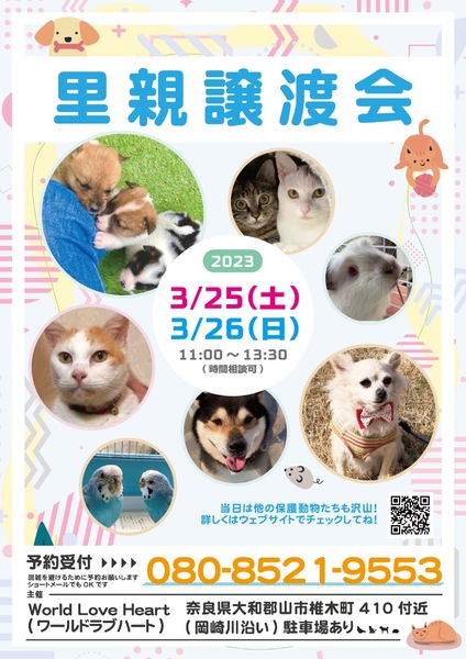 | イベント内容 | ワールドラブハートで里親募集中の動物たちの譲渡会を開催します! 犬・猫・鳥・ウサギなどたくさんの保護動物がいます。 みんな新しい家族を探しています。 写真だけでは伝えきれない魅力が盛りだくさん! 実際に会ってそのかわいさを実感してください♪ 子犬や子猫もたくさんいますよ♡ ●混雑をさけるために、事前予約をお願いします。 予約番号080-8521-9553 ショートメールでも可♪ ※当日までに譲渡が決定した・体調がすぐれないなど、やむを得ない理由で不参加の場合があります。ご希望の子がいましたら、当日お問い合わせください。 ※当日、その場での引き渡しはしておりません。譲渡決定後、自宅訪問を兼ねてこちらからお届け致します。 ご来場お待ちしております♪ world love heart https://worldloveheart-nara.jimdofree.com |