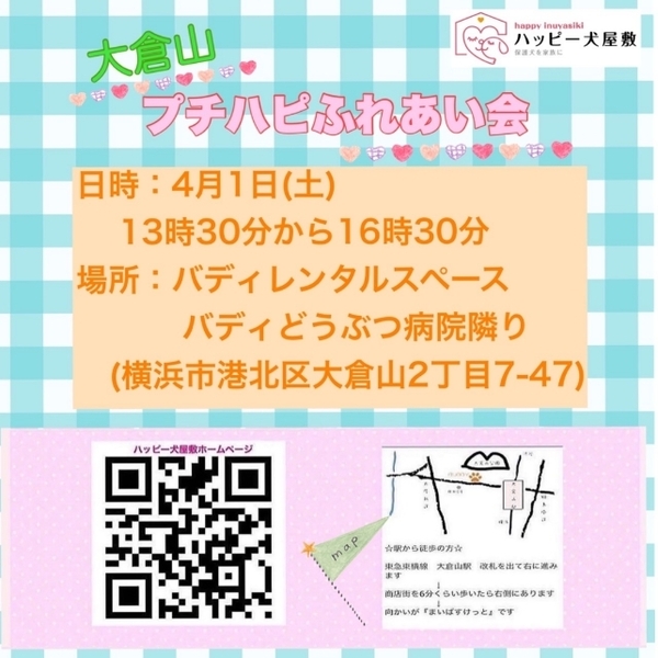 | イベント内容 | ご予約は必要ありませんが、ご来場の際の感染対策をお願いいたします。 (短時間の滞在時間となります) また、ワンコをお連れの場合は、紙オムツまたはマナーベルトの着用をお願いいたします。 ※新型コロナウイルスの感染状況により中止になる場合もございます。 しのママ、ぽえママのブログやインスタでご確認のうえご来場くださいませ。 色々とお願いごとばかりですが、よろしくお願いいたします。 日時: 2023年4月1日(土)13時30分から16時30分 場所: バディ動物病院隣り(横浜市港北区大倉山2-7-47(105) ※お越しいただく前に「ハッピー犬屋敷の里親の条件」をお読みいただきますよう、お願いいたします。 プチふれあい会は、預かりママや在校生のわんことじっくり話したり触れ合うことができますよ♪ 横浜方面のみなさま、どうぞ足をお運びくださいませ。 |