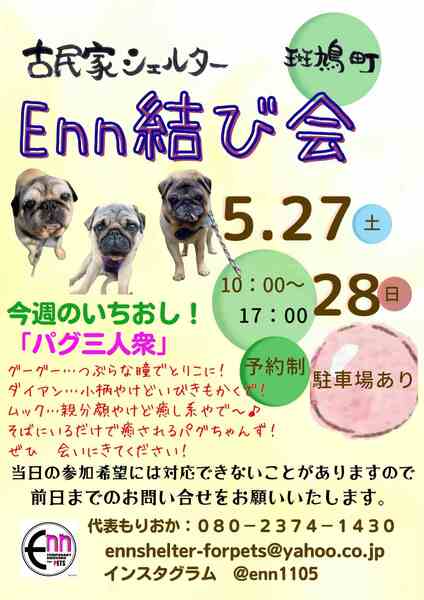 | イベント内容 | 毎週末に行っています「Enn結び会」 ほんとのおうち、ずっとの家族を待ってる子たちが まだまだいます! 写真や動画だけでは伝わらない保護っコたちの魅力に ぜひ触れていただき、家族としてお迎え入れをご検討ください。 お迎え入れご検討中の方 この機会ぜひ会いに来てあげてくださいね。 予約制となっております。 ☆開催日 毎土日祝 ☆時間 朝10時から17時までの間 ☆5組まで ☆駐車場あり 【お申込み・お問い合わせ】 ・ennshelter-forpets@yahoo.co.jp まで ・インスタグラム @enn1105 の DM ※当日の参加希望には対応できないことがあります。 できるだけ前日までにお問合せください。 ※事前に飼育環境などのアンケートにお答えいただいた後、 ご来場の日程をお返事させていただきます。 ※譲渡条件がありますので、全てのご応募にお応えできないことが あります事をご了承ください。 |