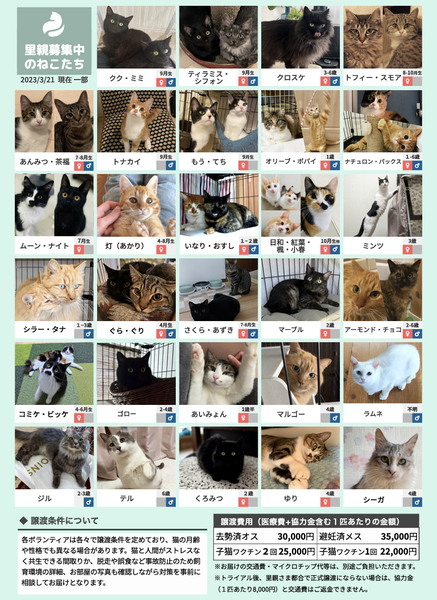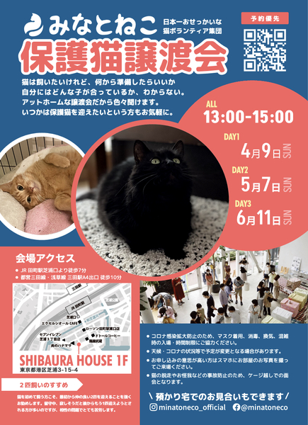 | イベント内容 | 2022年も270匹もの猫と里親さんのご縁を繋いだ毎月定期開催している譲渡会です。 ご予約はみなとねこのHPよりお願いします http://www.minatoneco.com 参加猫の詳細はこちら https://www.minatoneco.com/gallery 参加猫たちの様子はYoutubeのみなとねこチャンネルもご覧ください https://youtube.com/playlist?list=PLRxhCqU-Dt77IaUtZCDeratPPI7Jek6ZL ーーー 会場は明るく開放的な雰囲気です Youtube「みなとねこ譲渡会に行ってみよう」 https://youtu.be/8Q4Gti1swQk 25ケージ 50匹ほどの参加となりますが、それ以外の預かり宅の猫もご紹介可能です。 子猫は2匹ペアでの譲渡が原則です。 初めての方こそ最初から2匹をお勧めしています。 また私たちボランティアはご縁のあった猫たちに終生里親様に愛されて幸せに安全に暮らして欲しいと願っています。 このため里親になっていただくにはいくつかの条件やお約束事があります。 ■里親申込 事前誓約書 adobe.ly/35jdcb2 会場では申込書とお部屋のお写真を拝見してお迎えまでにご準備いただきたいことなどご説明します。 ■里親申込書 adobe.ly/2HqP1iI 会場にてご記入いただくことも可能ですが、お手元で印刷可能でしたら、ご記入の上ご来場いただくことをおすすめしております。 ※事前誓約書の3と4に該当がある方は是非事前にご相談ください。 また猫それぞれの月齢や保護主の考えにより、譲渡条件が加わる場合があります。 実際の参加予定猫は4/8(土)21:00までにみなとねこのHPやFacebookページでご紹介します。 https://m.facebook.com/minatoneco/ 直接ご応募の方は詳細をLINEなどでやりとりの上で預かり宅でのお見合いも行っております。 そうした中で譲渡会前に里親様が決定することもございますことご了承ください。 ※新型コロナの感染拡大防止の観点から予約優先、混雑時は入場をお待ちいただいたり、マスクの着用と消毒のご協力をお願いしております。 ※換気のためにドアをオープンしての開催のためにケージ越しでのご対面となりますことご理解ください。 ※譲渡会の開催や保護活動の継続のため、お一人様500円以上のご寄付をお願いしております。 |