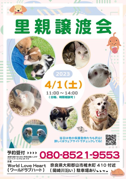 | イベント内容 | ワールドラブハートで里親募集中の動物たちの譲渡会を開催します! 犬・猫・鳥・ウサギなどたくさんの保護動物がいます。 みんな新しい家族を探しています。 写真だけでは伝えきれない魅力が盛りだくさん! 実際に会ってそのかわいさを実感してください♪ 子犬や子猫もたくさんいますよ♡ ●混雑をさけるために、事前予約をお願いします。 予約番号080-8521-9553 ショートメールでも可♪ ※当日までに譲渡が決定した・体調がすぐれないなど、やむを得ない理由で不参加の場合があります。ご希望の子がいましたら、当日お問い合わせください。 ※当日、その場での引き渡しはしておりません。譲渡決定後、自宅訪問を兼ねてこちらからお届け致します。 ご来場お待ちしております♪ world love heart https://worldloveheart-nara.jimdofree.com |