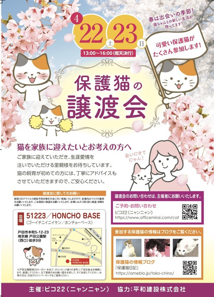 | イベント内容 | 2023年4/22(土)・ 4/23(日) 時間:13:00~16:00(雨天決行) <猫を家族に迎えたいとお考えの方へ> ご家族に迎えていただき、生涯愛情を注いでいただける里親様をお待ちしています。 猫の飼育が初めての方には、丁寧にアドバイスもさせていただきますので、ご安心ください。 会場:51223/HONCHO BASE(ゴーイチニイニイサン/ホンチョーベース) 戸田市本町5-12-23 埼京線 戸田公園駅(西口)徒歩3分。 ※戸田公園駅西口ロータリーを出て、オリンピック通りの本町二丁目交差点を横断し直進してく ださい。 立て看板のある細い道を左折してください。 お車の方は、付近のコインパーキングをご 使用ください。 ※会場までのルートは、以下のサイト内の動画をご参考になさってください。 <譲渡会に関してのお願い> 新型コロナウイルス感染予防対策を万全に行い実施いたしますので、 会場内はマスクの着用をお願いいたし ます。ご出発前に検温をお願いいたします。 会場にお入り頂く前に検温・消毒をお願いいたします。 <譲渡会に参加をご検討の皆様へ> 会場内の密を避けるため、ご予約をお願いいたします。 予約なしでも可能ですが、ご予約優先となりますので、お外でお待ちいただくこともございます。 皆様のご理解、ご協力をお願いいたします。 ご予約は、以下のサイト内お問い合わせフォームよりお願いいたします。 ●ご予約・お問い合わせ:ピコ22(ニャンニャン)https://www.officemirai.com/cat ●保護猫の情報ブログ『保護猫活動日記』:https://ameblo.jp/toko-chino/ |