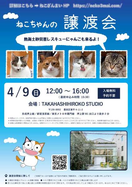 | イベント内容 | ~保護ねこちゃんを家族に迎えませんか?~ 「猫も!里親さんも!保護主も!みんなが笑顔になれる」そんな譲渡会になると良いな♪ 猫ちゃんと里親の赤い糸のご縁結び、どうぞねこざんまいにお手伝いさせて下さい♪ 新しい家族と猫たちの生活が楽しく素敵な毎日でありますように。 そんな生活が送れるよう保護主のサポートも万全です! 里親様決定は14時以降となります。 決定された方は当日説明会にご参加頂きますので、お時間に余裕を持ってご来場下さい。 ※11:30より早くいらしても、お待ちいただく場所がございません。 会場は住宅街にある為、近隣にお住まいの方にご迷惑となる場合がございますので、 受付開始時間にあわせてお越しくださいますよう、何卒ご協力お願い致します。 ※会場にはお手洗いがございません。最寄りの押上駅でご利用ください。 ねこざんまい譲渡会は先着順で里親様を決定する譲渡会ではありません。 先に申込みをした方を優先することもありません。 お話をして、その猫ちゃんに合ったおうちに決めさせていただいております。 12時に開場し、里親様の決定は14時以降となります。 14時以降にご入場の場合、希望の猫ちゃんが決定している可能性があります。 また1頭に対し多数の申込みをいただいた場合、早めに申込みを締め切らせていただく場合がございますので、予めご了承下さい。 開催日 2023年4月9日(日)12:00~16:00(最終申込み15:30) 『 押上会場 』 ☆☆☆予約不要・入場無料☆☆☆ 会場 TAKAHASHIHIROKO STUDIO 墨田区業平4-11-2 ※会場へのお問合せはご遠慮ください。 交通 形成押上線 押上駅 B1出口 徒歩2分 都営浅草線 押上駅 B1出口 徒歩2分 東京メトロ半蔵門線 押上駅 B1出口 徒歩2分 ※駐車場のご用意はございません。 近隣のコインパーキングをご利用ください。 ホームページ参加猫一覧はこちらから http://www.neko3mai.com/entrycats/entrycats.html ☆子猫希望の里親様☆ 子猫は下痢等により数時間対応ができなかっただけでも死に至る場合があります。 その為、ねこざんまいでは月齢によりお留守番時間の長さを制限させていただきます。 また、子猫ちゃん(6ヶ月未満)の里親様には子猫支援金のご協力をお願い致しております。 ☆ねこざんまいの譲渡会にご来場の里親様☆ 先着順ではございませんので、どうぞ譲渡会開始時間にご来場下さい。 ・譲渡会の流れはこちらから http://www.neko3mai.com/flow/flow.html ・譲渡の際にはいくつかのお約束事がございます。 http://www.neko3mai.com/condition/condition.html ・家族に迎える猫ちゃんが決まった場合、後日里親様のご自宅までお届けいたします。 当日に猫ちゃんをお渡しすることはできませんのでご了承ください。 ☆里親希望のみなさまへ☆ ご家族の皆様で生涯、家族の一員としてたっぷり愛情を注いでくださることを希望しています。 恐れ入りますが ●学生の方、子猫・幼猫希望の60才以上の方のみのご家庭 ●脱走防止対策にご協力いただけない方 は原則譲渡を遠慮させていただいております。 ●一人暮らし・同棲(事実婚)の方 保護主の希望や猫の年齢・性格等により、ご希望に添えない場合もございます。 ☆ご負担頂く費用☆ 譲渡の際に、医療費の一部、お届け時の交通費を里親様にご負担頂いております。 皆様のご協力により、より多くの猫達を救うことができております。 里親様の温かいお気持ちにボランティア一同、心より感謝いたしております。 ご負担頂く医療費につきましてはホームページに詳しく記載させて頂いております。 http://www.neko3mai.com/flow/flow.html ☆よくある質問☆ ・譲渡の条件 ・ご負担頂く費用 ・譲渡会の場所等は ホームページに詳しく掲載させて頂いておりますのでご覧ください。 https://neko3mai.com/ メールでのお問い合わせはすぐにご返答出来ない場合がございますのでご了承ください。 ホームページ https://neko3mai.com/ お問い合わせ http://www.neko3mai.com/contact/form_general.html ねこざんまいブログ http://ameblo.jp/neko3mai/ |