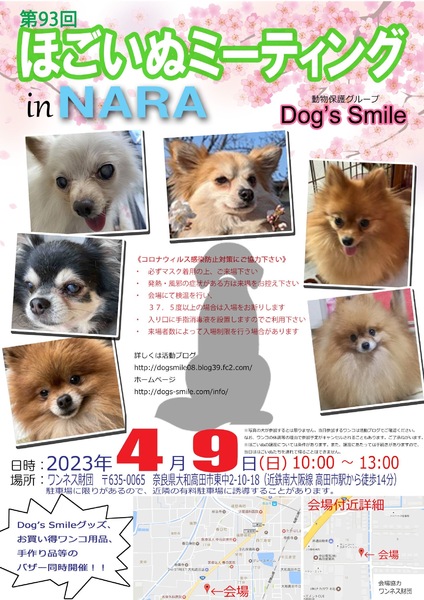 | イベント内容 | 4月9日(日曜日)、奈良県大和高田市のワンネス財団エモーショナルリテラシーセンターにて「第90回ほごいぬミーティングat奈良大和高田」を開催します。 保護犬を家族に迎えようと考えている方、保護犬に会ってみたい方、保護犬について知りたい方、ぜひご来場ください。 相性を見るためなど先住わんこさん、卒業わんこさんのご参加ももちろんOKです。 当日は、Dog's smileグッズやワンコ用品の販売、Dog's smileを応援してくださる方々が手作りされた手作り雑貨などの販売も行います。どれもお買い得です。 また、売り上げは、私たちの活動資金になります。ぜひご協力をお願いします。 来場者のみなさまには、コロナウイルス感染拡大防止に御協力をお願いします。 ・必ずマスクを着用の上、御来場ください。 ・発熱・風邪の症状のある方の入場は御遠慮願います。 ・入口にて検温を行い、37.5℃以上の場合は、入場をお断りします。 ・入場時は、手指消毒への御協力をお願いします。 ・来場者の状況により、入場制限を行う場合があります。 なお、来場予定のワンコについては、活動ブログでご確認ください。 日時 令和5年4月9日(日)午前10時~午後1時 場所 ワンネス財団エモーショナルリテラシーセンター 奈良県大和高田市東中2-10-18 (近鉄南大阪駅高田市駅から南に徒歩14分) 協力 ワンネス財団、株式会社松田電気工業 |