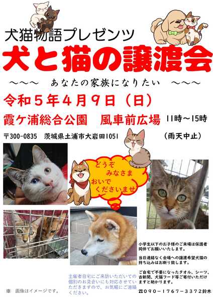 | イベント内容 | 霞ヶ浦総合公園(水郷公園)にての犬と猫の譲渡会です。 あなたとの出会いを待つワンニャンにぜひ会いにきてくださいませ。 11時~15時開催です。 この子も参加です! いいご縁をお願いいたします。 https://jmty.jp/ibaraki/pet-cat/article-10rq8x ●犬猫物語は土浦を中心とし保護活動、野良猫の避妊去勢などを行っている団体です。 犬猫の相談などはお電話くださいませ。 譲渡会への猫の参加も受け付けております。 当日いきなりの参加は不可能ですが、事前にご連絡ください。 お待ちしています(^^ 問い合わせは09017673372鈴木まで。非通知には出ません |