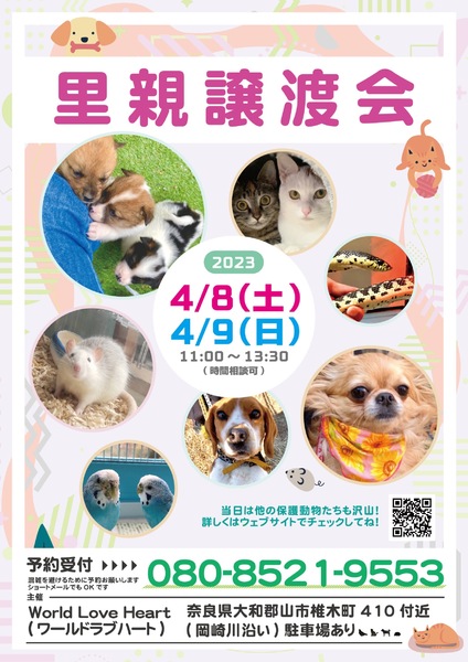 | イベント内容 | ワールドラブハートで里親募集中の動物たちの譲渡会を開催します! 犬・猫・鳥・ウサギなどたくさんの保護動物がいます。 みんな新しい家族を探しています。 写真だけでは伝えきれない魅力が盛りだくさん! 実際に会ってそのかわいさを実感してください♪ 子犬や子猫もたくさんいますよ♡ ●混雑をさけるために、事前予約をお願いします。 予約番号080-8521-9553 ショートメールでも可♪ ※当日までに譲渡が決定した・体調がすぐれないなど、やむを得ない理由で不参加の場合があります。ご希望の子がいましたら、当日お問い合わせください。 ※当日、その場での引き渡しはしておりません。譲渡決定後、自宅訪問を兼ねてこちらからお届け致します。 ご来場お待ちしております♪ world love heart https://worldloveheart-nara.jimdofree.com |