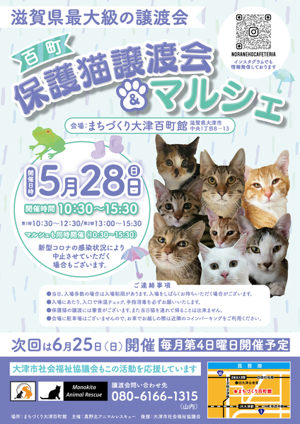 | イベント内容 | 滋賀県最大級の保護猫譲渡会。 毎回40頭以上の猫さんが参加します。 初めての方でも安心して譲渡の安心サポートの譲渡会です。 予約不要、入場無料。 参加猫さんのご紹介は https://ameblo.jp/hyakucyojyoutokai または、Instagram @hyakucyoujyotokai をご覧下さい。 |