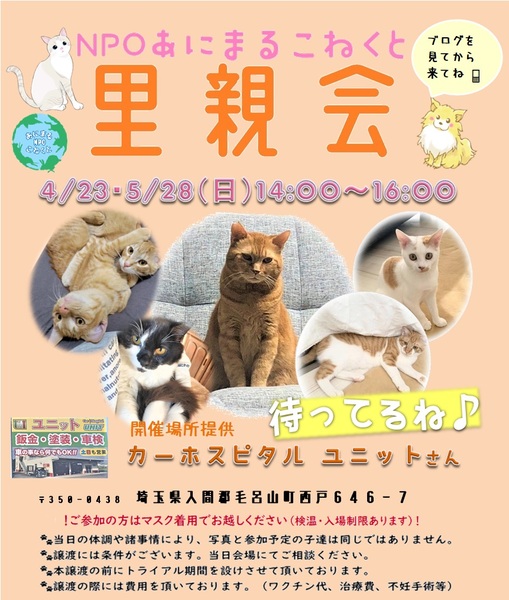 | イベント内容 | 子猫から成猫まで参加します! グッズ販売もあります♪ ※先着順ではなく里親会後に協議してより良い条件のご家族を選定させて頂いておりますので、お時間早い方が有利という事はありません^^ |