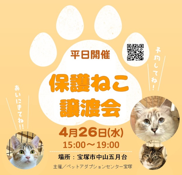 | イベント内容 | 「土日は休みにくい。」や、 「平日、仕事帰りにサクッと行ければ…」 というご要望にお答えして、平日譲渡会を開催します。 日時:2023年4月26日(水) 〇15時~16時 〇16時~17時 〇17時~18時 〇18時~19時 〇19時~20時 上記より、ご都合のいい時間帯を予約して下さい。 ご予約はこちらから↓↓(予約フォームに飛びます) https://ssl.form-mailer.jp/fms/45245951781416 ※予約状況により、時間の変更をお願いする場合があります。 ※当日、猫を連れて帰る事はできません。 詳しくはブログをご覧下さい。 https://ameblo.jp/takarazuka-tnr/ |