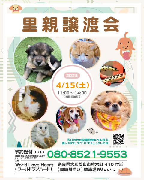 | イベント内容 | ワールドラブハートで里親募集中の動物たちの譲渡会を開催します! 犬猫だけではなく、インコやラット、ウサギにモルモットなどたくさんの保護動物がいます! みんな新しい家族を探しています。写真だけでは伝えきれない魅力が盛りだくさん! 実際に会ってそのかわいさを実感してください♪ ★里親募集中の動物たち★ ・犬、猫 ・ウサギ ・モルモット ・ファンシーラット ・スキニーラット ・インコ ・キンカチョウ ・モルモット ・ウコッケイ ・ヘビ ・カメ ……など 子犬や子猫もたくさんいますよ♡ ぜひお気軽にお越しください! ●混雑をさけるために、事前予約をお願いします。 予約番号080-8521-9553 ショートメールでも可♪ ※当日までに譲渡が決定した・体調がすぐれないなど、やむを得ない理由で不参加の場合があります。ご希望の子がいましたら、当日お問い合わせください。 ※当日、その場での引き渡しはしておりません。譲渡決定後、自宅訪問を兼ねてこちらからお届け致します。 ご来場お待ちしております♪ ●world love heart(ワールドラブハート)は、奈良県大和郡山市で活動している動物保護団体です。 『引き取り依頼は断らない』をモットーに、犬、猫、鶏、小動物、家畜、爬虫類など捨てられた動物を保護しています。 https://worldloveheart-nara.jimdofree.com |