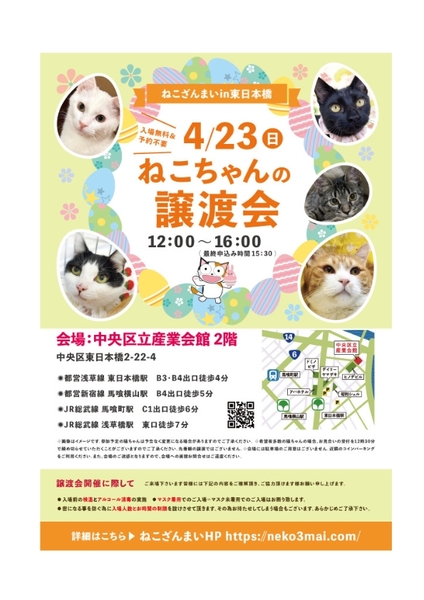| イベント内容 | ~保護ねこちゃんを家族に迎えませんか?~ 「猫も!里親さんも!保護主も!みんなが笑顔になれる」そんな譲渡会になると良いな♪ 猫ちゃんと里親の赤い糸のご縁結び、どうぞねこざんまいにお手伝いさせて下さい♪ 新しい家族と猫たちの生活が楽しく素敵な毎日でありますように。 そんな生活が送れるよう保護主のサポートも万全です! 11:30より、2階会場入口にて受付を開始します。 ※11:30より早くいらしても、お待ちいただく場所がございません。 また、近隣にお住まいの方や他階フロアのご利用者様にご迷惑となる場合がございますので、受付開始時間にあわせてお越しくださいますよう、何卒ご協力お願い致します。 また、ねこざんまい譲渡会は先着順で里親様を決定する譲渡会ではありません。 先に申込みをした方を優先することもありません。 お話をして、その猫ちゃんに合ったおうちに決めさせていただいております。 12時に開場し、里親様の決定は14時以降となります。 14時以降にご入場の場合、希望の猫ちゃんが決定している可能性があります。 また1頭に対し多数の申込みをいただいた場合、早めに申込みを締め切らせていただく場合がございますので、予めご了承下さい。 開催日 2023年4月23日(日)12:00~16:00(最終申込み15:30) 『 東日本橋会場 』 ☆☆☆予約不要・入場無料☆☆☆ 会場 中央区立産業会館2階 中央区東日本橋2-22-4 ※会場へのお問合せはご遠慮ください。 交通 都営浅草線 東日本橋駅 B3又はB4出口 徒歩4分 都営新宿線 馬喰横山駅 B4出口 徒歩5分 JR総武線 馬喰町駅 C1出口 徒歩6分 JR総武線 浅草橋駅 東口 徒歩7分 ※駐車場のご用意はございません。 近隣のコインパーキングをご利用ください。 ホームページ参加猫一覧はこちらから http://www.neko3mai.com/entrycats/entrycats.html ☆子猫希望の里親様☆ 子猫は下痢等により数時間対応ができなかっただけでも死に至る場合があります。 その為、ねこざんまいでは月齢によりお留守番時間の長さを制限させていただきます。 また、子猫ちゃん(6ヶ月未満)の里親様には子猫支援金のご協力をお願い致しております。 ☆ねこざんまいの譲渡会にご来場の里親様☆ 先着順ではございませんので、どうぞ譲渡会開始時間にご来場下さい。 ・譲渡会の流れはこちらから http://www.neko3mai.com/flow/flow.html ・譲渡の際にはいくつかのお約束事がございます。 http://www.neko3mai.com/condition/condition.html ・家族に迎える猫ちゃんが決まった場合、後日里親様のご自宅までお届けいたします。 当日に猫ちゃんをお渡しすることはできませんのでご了承ください。 ☆里親希望のみなさまへ☆ ご家族の皆様で生涯、家族の一員としてたっぷり愛情を注いでくださることを希望しています。 恐れ入りますが ●学生の方、子猫・幼猫希望の60才以上の方のみのご家庭 ●脱走防止対策にご協力いただけない方 は原則譲渡を遠慮させていただいております。 ●一人暮らし・同棲(事実婚)の方 保護主の希望や猫の年齢・性格等により、ご希望に添えない場合もございます。 ☆ご負担頂く費用☆ 譲渡の際に、医療費の一部、お届け時の交通費を里親様にご負担頂いております。 皆様のご協力により、より多くの猫達を救うことができております。 里親様の温かいお気持ちにボランティア一同、心より感謝いたしております。 ご負担頂く医療費につきましてはホームページに詳しく記載させて頂いております。 http://www.neko3mai.com/flow/flow.html ☆よくある質問☆ ・譲渡の条件 ・ご負担頂く費用 ・譲渡会の場所等は ホームページに詳しく掲載させて頂いておりますのでご覧ください。 https://neko3mai.com/ メールでのお問い合わせはすぐにご返答出来ない場合がございますのでご了承ください。 ホームページ https://neko3mai.com/ お問い合わせ http://www.neko3mai.com/contact/form_general.html ねこざんまいブログ http://ameblo.jp/neko3mai/ |