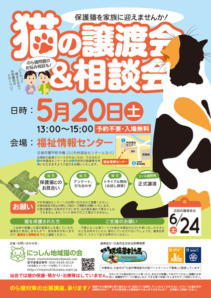 | イベント内容 | 5月20日(土)に「猫の譲渡会&相談会」を開催いたします。 猫少なめのミニ譲渡会&相談会です。 保護猫を迎えたい方はもちろん、猫に関する相談会も同時開催しておりますので、ご近所との猫トラブルなどでお悩みの方もお気軽にお立ち寄りください! 地域猫活動やペット防災についての展示もございます(^^)/ 【日時】2023年5月20日(土)13:00〜15:00 【会場】福祉情報センター(中央福祉センターとなり) 【主催】にっしん地域猫の会 【ホームページ】https://nissinchiikineko.main.jp ※重症化リスクの高い方々が多く利用される福祉センターの施設をお借りしているため、引き続き感染症拡大防止にご理解・ご協力をお願いいたします(受付名簿のご記入、室内の人数制限など)。 ※会場前に駐車場がございますが、数が少ないため、満車時は中央福祉センターの駐車場をご利用ください。図書館のむかいにある市役所の臨時駐車場もご利用いただけます。 ※室内換気のため冷房・暖房が効きにくい場合がございます。 ※ペット同伴のご入場はできませんので、予めご了承ください。 ※譲渡会に関しまして、福祉センターへのお問い合わせはご遠慮ください。 ※猫ちゃんの譲渡には条件がございます。詳細はホームページをご参照ください。 |