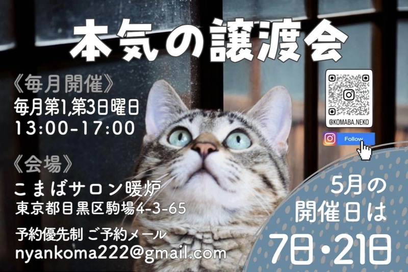 | イベント内容 | 【〜本気の譲渡会〜】 主催者様のご厚意により、ねこけん保護猫も参加させていただいております! 詳細につきましては、必ず主催者様のホームページ等をご確認ください。 [主催] 保護猫譲渡会カフェ こまばサロン暖炉 [ホームページ] https://komaba-honki.amebaownd.com/ [Instagram] https://www.instagram.com/komaba.neko/ [FBページ] https://www.facebook.com/nyankomaba ーーー すぐに猫を迎えられる環境(ペット可の集合住宅に居住している等)が準備できているかたに参加していただきたいので「本気(ほんき)の譲渡会」というタイトルをつけています。 譲渡会当日の申し込みは必須ではありません。家族に迎えたい猫がいなかった場合は、見つかるまで何度でも参加お願いします。 また、「猫と暮らしたい」気持ちはあるがどんな猫と暮らしたいかよくわからない場合もお気軽にご参加お願いします。猫経験豊富なボランティアが、相性が良さそうな猫を一緒に考えてアドバイスさせていただきますが、猫をこちらで決定し押し付けることはありませんのでご安心ください。相性が良さそうな猫が参加していない場合は、ボランティア仲間が保護している相性が良さそうな猫を一緒に探します。画像や動画をスマホなどで一緒に見ていただいて気になる猫が見つかりましたら後日お見合いしていただくことも可能です。 予約優先制となります。 60分毎入れ替え制 各回10名まで 60分で猫ちゃんを選んで、お申し込みの方はお申し込みのお部屋へ移動してください。 お申し込みのない場合はそのままご退出ください。 事前予約の際にお声のかからなかった猫は参加しない可能性もありますので、気になる子がいたらご予約の際にお伝えお願いします。 トラブル防止のため、電話ではなくメールでのご予約をお願いします。 様々な理由で保護された猫達の里親さんを探す譲渡会です。 個人ボランティアが多く参加しますので、 保護主によって応募条件や譲渡費用が異なります。 お申込み後は保護主によって多少違いますが大体以下の流れになります。 ①猫ちゃんと暮らすグッズ(トイレ、食器、フード、キャリーバッグ、ケージ等)を揃えていただき、必要であれば脱走対策をしてください。 ②上記準備ができましたら保護主が猫ちゃんをご自宅までお届けしてトライアル(通常1週間程度。先住猫がいる、なれるのに時間がかかる猫など場合によって延長可能です)していただき、猫と幸せに生活できるか確認お願いします。 ③そのまま家族として生活OKであれば正式譲渡になります。 ④生活していくのが難しい場合はトライアル中止をお申し出ください。猫をお迎えに行きます。事務手続き費用及び送迎費用を除いた譲渡費用を返却します。 ーーー 【予約方法】主催者様宛メール予約 nyankoma222@gmail.com ●お名前 ●参加を希望する譲渡会日 ●時間(①13:00~ ②14:00~ ③15:00~ ④16:00~) ●参加人数 ●会いたい猫ちゃんの名前 上記をご記入のうえご予約ください。 【会場】 東京都目黒区駒場4-3-65 レンタルスペースこまばサロン暖炉 ※最寄駅:駒場東大前駅 徒歩 8分 :代々木上原駅 徒歩13分 |