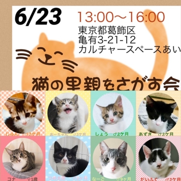 | イベント内容 | 猫の里親会@亀有ちびにゃんず 【猫の里親会@亀有】 JR亀有駅より徒歩3分 《日時》 6月23日(日)午後1時~4時 《場所》 東京都葛飾区亀有3-21-12 カルチャースペースあい 室内開催 ご予約は不要です、お気軽にいらっしゃってください。 《アクセス》 JR亀有駅南口から徒歩3分 お車でお越しの方はお近くのコインパーキングをご利用ください。 ご家族の皆様で生涯、家族の一員としてたっぷり愛情を注いでくださるご家庭をお待ちしております。 ご希望に添えない場合もございますのでご了承下さい。 【以下の方には譲渡しておりません】 ・猫の飼育が許可されていない住居にお住まいの方 ・未成年者、友人同士&同棲でお住まいの方、乳児のいるご家庭 ・高齢者のみのご家庭の方 ・脱走防止対策にご協力頂けない方 ・経済的に不安定な方(休職中、就職活動中、アルバイト等) ・単身者の場合には別途条件 ※60~65才だけの世帯の場合は、飼育経験や環境、猫の性格を考慮し飼いきれる年齢の猫をご紹介しています。 【当里親会は猫さんと里親様とのマッチングを大切にしています】 はじめて猫さんをお迎えする場合に適した猫さん、お留守番の長い里親さんに適した猫さん等、 お迎えする不安など経験豊富なスタッフがお話を聞き、アドバイスさせていただいています。 お気軽にお声をかけてください♪ 【ご負担頂く費用について】 譲渡の際に譲渡負担金(医療費の一部、譲渡金、お届け時の交通費)を里親様にご負担頂く事により 飼い主のいない猫の継続的治療や保護、新しいご家族の元へ送り出す事ができます。 ご理解とご協力をお願い致します。 ◆ご負担頂く医療費につきましては個々の猫(子猫、成猫、♂、♀)によって異なります◆ ★仔猫8.000~14.000 (ワクチン・ウイルスチェック・駆虫) ★成猫15.000~20.000 (ワクチンウイルスチェック・駆虫・不妊去勢手術済) ★猫をお届けする時の交通費をいただいております。 1500〜実費 【譲渡の条件がございます】 ①終生飼育 ②完全室内飼育 ③不妊・去勢手術 ④譲渡負担金 ⑤契約書の署名捺印 ⑥定期報告義務 をご了承ください。 ●当日譲渡会場での引き渡しはございません。 ●お迎え準備が整いましたらご自宅にお届けしトライアル開始となります。トライアル期間は全ての猫さんに設けております。 ●トライアル期間を経て初めて正式譲渡となります 【譲渡の流れ】 気に入った猫がいましたらお申込みアンケートにご記入いただきます ↓ 審査&ご相談 ↓ 飼育に必要な物のご用意 ↓ お届け ↓ トライアル(猫によって期間が変わります) ↓ 正式譲渡(契約書へのサインをお願いします) 猫の為に何かできることはないか?!と思っておられる方 私達のお手伝いをしていただけませんか? ☆猫の預かりさん募集しています 乳飲み子・仔猫・成猫 預かりさんの状況に合わせてお願いしています。 里親さんが決まるまでの一定期間だけ、お世話してくださる猫好きな方大歓迎(^^) 【猫の里親をさがす会】 https://blog.goo.ne.jp/bobton @shosukereiko |