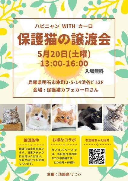 | イベント内容 | 猫の譲渡会 日時:5月20日(土)13時から16時まで(譲渡会参加は無料です) 場所:明石市本町2-5-14 浜谷ビル2階 保護猫カフェ・カーロ (お問合せはカーロさんにしないようにお願いします) ★お車の方は近隣にコインパーキングがたくさんありますので ご駐車お願いします 猫ちゃんがたくさん参加しています♪ 本気で猫を飼いたい方是非ご来場ください♫ 早い順ではございませんが早くに決まってしまう場合がございますので お早めにお越しいただくか面会予約をお願いします ※猫の譲渡は無料ではありません(譲渡会参加は無料です) ※当日連れて帰れません ※譲渡条件があります ●参加猫たちのお紹介やお問い合わせ(面会予約等)は ブログよりご連絡お願いします https://ameblo.jp/wan--love--nyan/ 主催:ハピニャン |