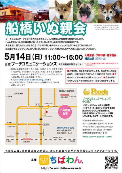 | イベント内容 | 5月船橋いぬ親会のご案内です。 poochさんのご厚意により、プーチコミュニケーションズ(船橋市駿河台)のドッグランをお借りして「船橋いぬ親会」を継続開催することになりました。 屋根付きのドッグランでの開催になります。 【ちばわんからのお願い】 ①会場内ではマスクの着用をお願いします。 ②入場の際、検温と消毒をいたします。体温が37.5℃以上の場合、入場をお断りさせていただく場合があります。 ③会場内が密にならないよう入場制限をさせていただく場合があります。 開催日:5月14日(日)11:00~15:00 屋外開催(屋根付きドッグラン) 小雨決行 場所:プーチコミュニケーションズ 千葉県船橋市駿河台2-9-1 【アクセス】 プーチコミュニケーションズ 飯山満駅から徒歩約20分 JR東船橋駅から徒歩約20分 県道8号線 吹上交差点~駿河台交差点間にあるファミリーマートの裏手になります。 リサイクルショップとファミリーマートの間の道へ進み、最初のT字路を左折してください。 ※店舗の駐車場は5台分のみとなりますので混雑時にはご利用いただけない場合がございます。 満車の場合はコインパーキングをご利用下さい。 《注意事項》 【当日の流れ】 (1)家族募集中のいぬとお会いになりたい方はどなたでも自由にご参加いただくことができます。ちばわんボランティアは名札をつけておりますので、ご遠慮なくお声をかけて下さい。また、募集中のいぬのそばには預かりボランティアが控えておりますのでいぬの性格や生活習慣など、遠慮なくご質問ください。 (2)ご希望のいぬが決まったら、お申し込みアンケートにご記入の上、ボランティアにお渡し下さい(前日までにメールでアンケートを送信してお申し込みいただくこともできます。) ◆「いぬ」アンケート送信先: http://chibawan.net/contactform_dog (3)アンケート内容を拝見し、お話させていただきます。 (4)原則として一両日中にお返事の連絡をさせていただきます。 (5)ご縁が成立した場合には、後日、こちらからご自宅までいぬをお届けし、約1ヶ月のお試し生活に入っていただきます。お届けの際に、書面での譲渡契約書を交わします。 ※ワクチン・不妊手術代など保護犬にかかった費用は、家族になるいぬ親さんにもご負担をお願いしています 《お知らせ》 ◆会場ではチャリティグッズを販売します 売上金は保護した犬猫の医療費など、 ちばわん活動費として大切に使わせていただきます 《お問い合わせ》 いぬ親会について:http://chibawan.net/inquiry_chiba ※いぬ親会当日はメールが見られません。また、お問い合わせの際は、必ず「具体的な件名」を入れて多数の迷惑メールと区別がつくようにお願いいたします。 ※本イベントに関するPoochさんへのお問い合わせはご遠慮ください。 船橋いぬ親会イベントホームページ https://chibawan.net/event/20230514-funabashi-dog ちばわんホームページ https://chibawan.net/ |