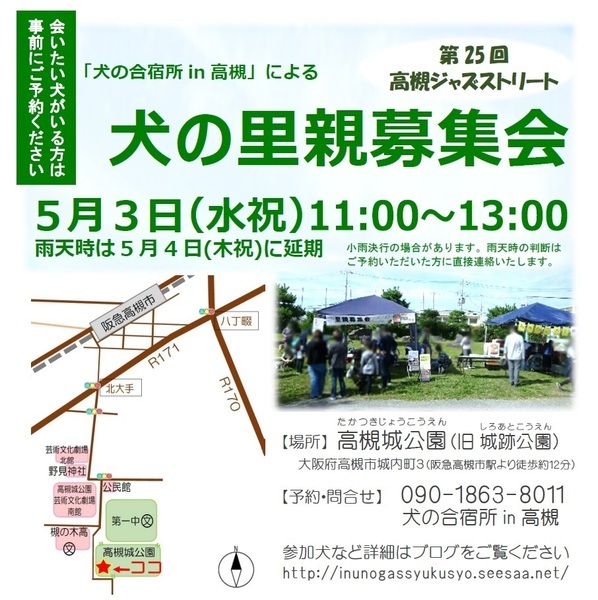 | イベント内容 | ※高槻ジャズストリートとの同時開催で、高槻城公園内で犬と猫の里親募集会を行います。 ※雨天時は5月4日(木・祝)に延期。 (小雨決行の場合もあります。雨天時の判断は予約いただいた方に直接連絡いたします。) ※すべての犬が参加するわけではありません。 また、感染症対策のため、犬ごとに時間を区切っての予約制にさせて頂きますので、会いたい犬がいる方は事前にご予約下さい。 【ご予約・お問合せ等は➡090-1863-8011 ※先住犬がいる場合は、是非是非、先住犬を連れて来て下さい。 ※マスク着用をお願いいたします。 ※お見合い希望がなければ参加しないワンコもいます。 ご来場予定の方は必ず電話での確認・予約をお願いします。➡090-1863-8011 ※「高槻ジャズストリート」という大きなイベントの一角で行いますので 近隣のコインパーキングは混雑が予想されます。 公共交通機関のご利用を強くお勧めします。 ※ ねこは「With Cat」さんが参加されます。 ※ 参加犬については、電話またはブログ「犬の合宿所」での直前チェックをお願いします。 【ご予約・お問合せ・連絡先】 090-1863-8011 |