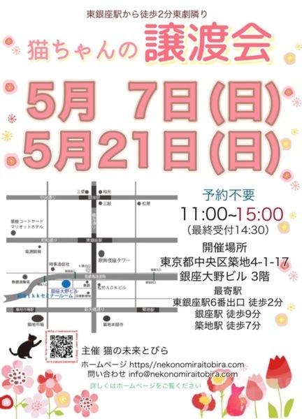 | イベント内容 | 東銀座で保護猫の譲渡会を開催しています「猫の未来とびら」です♪ 恵まれない環境にいる猫たちが未来へのとびらを開いて幸せなご縁に繋がる橋渡しをしていきます。 たくさんの猫ちゃんと保護主・スタッフ一同みなさまのご来場を心よりお待ちしています! 子猫ちゃん〜成猫ちゃんまで参加します♪ ※既にみなさまご存じのとおり、コロナ対策のマスク着用が緩和されました。 マスクを着用するかどうかは個人の判断となりましたが、 感染防止対策の上では、マスクは有効な手段です。 当会としましては、従来通りマスク着用をお願いしたいと思います※ 【ご来場いただく皆様には下記についてお願い致します】 ★不織布マスクの着用をお願い致します。 ★譲渡会場にお入り頂く前に手洗いと手の消毒をお願い致します。 ★熱のある方や体調の優れない方は譲渡会への来場を見合わせて頂けますよう、お願い致します。 ★来場者数によりましては人数制限もありますので長時間お待たせてする場合もございます。 予めご了承下さい。 コロナウイルス感染防止の為、大変恐縮ですが何卒ご理解とご協力、ご了承をいただけますようお願い致します。 ★☆★★☆★★☆★★☆★★☆★★☆★★☆★★☆★★☆★ ★開催日時 2023年5月7日(日) 11:00~15:00(最終受付 14:30) ★会場 東京都中央区築地4-1-17 銀座大野ビル 3階 (東劇となり) ★最寄駅 東銀座駅 6番出口 徒歩2分 銀座駅 徒歩9分 ・築地駅 徒歩7分 駐車場は当ビル又は近隣のコインパーキング等をご利用ください。 会場への直接のお問い合わせはご遠慮くださいませ。 ★☆★★☆★★☆★★☆★★☆★★☆★★☆★★☆★★☆★ 会場で猫ちゃんと触れ合ってご縁を繋いでください。 里親様・猫ちゃんが双方、幸せな家族になれるよう保護主・スタッフがサポート致します。 ご不安な事はお気軽にご相談ください。 入場無料です。事前のご予約は不要です。 当日猫ちゃんの引き渡しはございません。 後日、保護主が里親様宅へお届けいたします。 ※参加予定猫ちゃんは、急な体調不良等で不参加になる場合もございます。 開催当日の朝、当会ブログにて不参加の最新情報を掲載致しますのでご確認をお願い申し上げます。 ◇譲渡に関してのお願い・基本条件 1.家族の一員として終生最期まで愛育下さい。 2.完全室内飼い・ペット可のお住まい(契約書を拝見致します) 3.脱走防止対策 4.避妊・去勢手術 5.里親様のご自宅へのお届け 6.譲渡誓約書への署名捺印・身分証明書の提示 7.医療費譲渡金のご負担 8.定期報告 9.トライアル期間有り ※保護主により譲渡条件は異なりますので会場で直接ご相談ください。 60才以上の方のみのご家庭、未成年の方、単身の方、同棲中の方、 小学生低学年以下のお子様のいる方、必要な脱走対策を施していただけない方は譲渡をご遠慮頂く場合もございますのでご了承ください。 仔猫の場合は主にお世話される方のご年齢は55歳までとさせて頂きます。 オーバーする方はご相談くださいませ。 小さな子猫の譲渡は体重が1kgになってからのお届けやお留守番の無い(少ない)ご家庭を希望いたします。 医療費譲渡金に関しましては詳しくはホームページの 【譲渡に関してのお願い】【譲渡の流れ】をご覧くださいませ。 ~主催 猫の未来とびら~ |