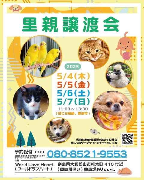 | イベント内容 | ワールドラブハートで里親募集中の動物たちの譲渡会を開催します! 犬猫だけではなく、インコやラット、ウサギにモルモットなどたくさんの保護動物がいます! みんな新しい家族を探しています。写真だけでは伝えきれない魅力が盛りだくさん! 実際に会ってそのかわいさを実感してください♪ ★里親募集中の動物たち★ ・犬、猫 ・ウサギ ・モルモット ・ファンシーラット ・スキニーラット ・インコ ・キンカチョウ ・モルモット ・ウコッケイ ・ヘビ ・カメ ……など 子犬や子猫もたくさんいますよ♡ ぜひお気軽にお越しください! ●混雑をさけるために、事前予約をお願いします。 予約番号080-8521-9553 ショートメールでも可♪ ※当日までに譲渡が決定した・体調がすぐれないなど、やむを得ない理由で不参加の場合があります。ご希望の子がいましたら、当日お問い合わせください。 ※当日、その場での引き渡しはしておりません。譲渡決定後、自宅訪問を兼ねてこちらからお届け致します。 ご来場お待ちしております♪ ●world love heart(ワールドラブハート)は、奈良県大和郡山市で活動している動物保護団体です。 『引き取り依頼は断らない』をモットーに、犬、猫、鶏、小動物、家畜、爬虫類など捨てられた動物を保護しています。 https://worldloveheart-nara.jimdofree.com * ワールドラブハートで里親募集中の動物たちの譲渡会を開催します! 犬・猫・鳥・ウサギなどたくさんの保護動物がいます。 みんな新しい家族を探しています。 写真だけでは伝えきれない魅力が盛りだくさん! 実際に会ってそのかわいさを実感してください♪ 子犬や子猫もたくさんいますよ♡ ●混雑をさけるために、事前予約をお願いします。 予約番号080-8521-9553 ショートメールでも可♪ ※当日までに譲渡が決定した・体調がすぐれないなど、やむを得ない理由で不参加の場合があります。ご希望の子がいましたら、当日お問い合わせください。 ※当日、その場での引き渡しはしておりません。譲渡決定後、自宅訪問を兼ねてこちらからお届け致します。 ご来場お待ちしております♪ world love heart https://worldloveheart-nara.jimdofree.com |