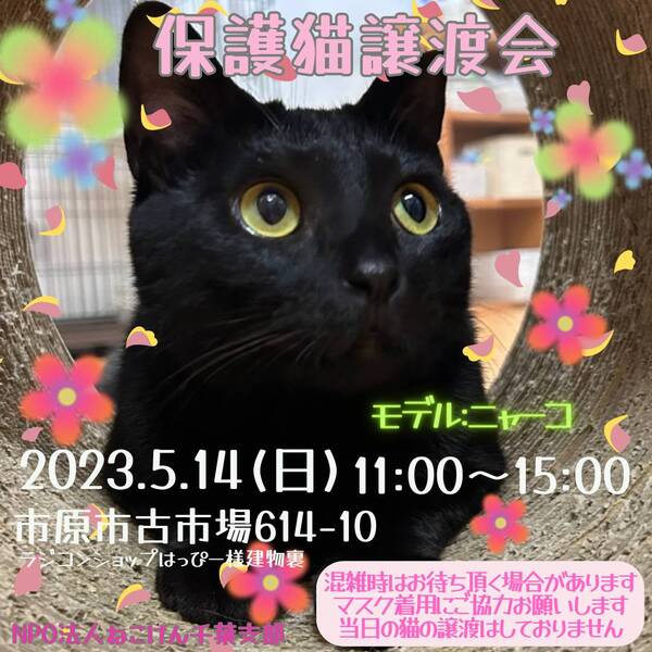 | イベント内容 | もうすぐ1歳の子猫から大人猫まで、沢山の保護猫達が譲渡会に参加します♪ ブログにて、譲渡会に参加する猫さん達を紹介しております。 ねこけん千葉支部ブログ→ https://ameblo.jp/nekoken-chiba/ 通常スタイルの譲渡会と致しますが、コロナウイルス対策として ・会場内ではマスクのご着用と入退室の際は消毒をお願い致します。 ・ご予約無しでお越しいただけますが、混雑時は整理券を配らせていただきます。 ご協力の程よろしくお願い致します。 また、譲渡会会場では、千葉県内にお住いの預かりボランティアさん及びお世話ボランティアさんを募集しています。 ご希望の方は、大変お手数をおかけしますが、譲渡会までお越しください。 ※ご都合がつかない場合は、お問い合わせ先までご相談ください。 [日時] 5月14日(日)11:00~15:00 [会場] 千葉県市原市古市場614-10 ※屋内での開催となり雨天決行です。 ※抱っこもOK! ※猫ちゃんの負担も考え、ご来場は時間内にお願い致します。 ※特にご予約などは必要ございませんのでご家族皆様でぜひお越し下さい。 ※駐車場あり。 [交通] 交通機関を利用してお越しの方 JR内房線 浜野駅より徒歩13分 浜野駅は、東京駅から京葉線→内房線でおよそ50分の距離!! お車でお越しの方 京葉道路蘇我インターより車で10分 ※駐車場はラジコンショップハッピー様裏手にございます駐車場をご利用ください [譲渡ご希望の方へのお願い] 誠に恐れ入りますが下記に当てはまります方への譲渡は不可となりますので予めご了承下さい。 ①学生さん、未成年の方、安定収入のない方 ②ペットを飼う事を許されていない住宅にお住まいの方 ③身体的、精神的疾病で治療中の方 ※60歳以上の方は別途条件がございますのでご相談下さい。 [譲渡の流れ] お申込み→審査→後日お届け→トライアル→正式譲渡 ※当日のお連れ帰りは出来ませんので予めご了承ください。 ※仮譲渡時にご希望の猫ちゃんにかかった医療費(血液検査・ワクチン・駆虫・不妊去勢手術等)をご負担願います。 しかし、正式譲渡に至らなかった場合は医療費を全額返済致します。 [主催] 動物愛護団体 NPO法人ねこけん 千葉支部 [ブログ] https://ameblo.jp/nekoken-chiba/ [参加動物] 成猫・子猫(ねこけん保護猫以外の猫ちゃんも参加予定です) [お問い合わせ] ご不明な点、ご質問等ございましたら下記までお問い合わせください。 chiba.info@nekoken.jp |