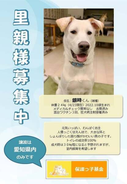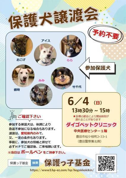 | イベント内容 | 保護犬の譲渡会を開催します!!予定は子犬が5頭、成犬1頭参加予定です!! 医療機関での譲渡会ですので、マスク着用でお願いします。持ち物はボールペンをお願いします。 不明な点は、「保護っ子基金」のホームページからご質問ください。よろしくお願い致します。 ★保護っ子基金 HP https://www3.hp-ez.com/hp/hogokkokikin ★子犬ちゃんの動画ができました!! 楽しいので、是非是非 見てください ↓ 仔犬ちゃん 里親募集中 | 夢を追いかけて (ameblo.jp) |