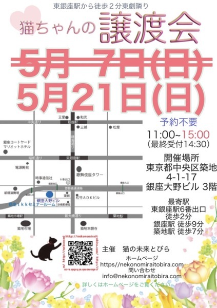 | イベント内容 | 東銀座で保護猫の譲渡会を開催しています「猫の未来とびら」です♪ 恵まれない環境にいる猫たちが未来へのとびらを開いて幸せなご縁に繋がる橋渡しをしていきます。 たくさんの猫ちゃんと保護主・スタッフ一同みなさまのご来場を心よりお待ちしています! 子猫ちゃん〜成猫ちゃんまで参加します♪ ※既にみなさまご存じのとおり、コロナ対策のマスク着用が緩和されました。 マスクを着用するかどうかは個人の判断となりましたが、 感染防止対策の上では、マスクは有効な手段です。 当会としましては、従来通りマスク着用をお願いしたいと思います※ 【ご来場いただく皆様には下記についてお願い致します】 ★不織布マスクの着用をお願い致します。 ★譲渡会場にお入り頂く前に手洗いと手の消毒をお願い致します。 ★熱のある方や体調の優れない方は譲渡会への来場を見合わせて頂けますよう、お願い致します。 ★来場者数によりましては人数制限もありますので長時間お待たせてする場合もございます。 予めご了承下さい。 コロナウイルス感染防止の為、大変恐縮ですが何卒ご理解とご協力、ご了承をいただけますようお願い致します。 ★☆★★☆★★☆★★☆★★☆★★☆★★☆★★☆★★☆★ ★開催日時 2023年5月21日(日) 11:00~15:00(最終受付 14:30) ★会場 東京都中央区築地4-1-17 銀座大野ビル 3階 (東劇となり) ★最寄駅 東銀座駅 6番出口 徒歩2分 銀座駅 徒歩9分 ・築地駅 徒歩7分 駐車場は当ビル又は近隣のコインパーキング等をご利用ください。 会場への直接のお問い合わせはご遠慮くださいませ。 ★☆★★☆★★☆★★☆★★☆★★☆★★☆★★☆★★☆★ 会場で猫ちゃんと触れ合ってご縁を繋いでください。 里親様・猫ちゃんが双方、幸せな家族になれるよう保護主・スタッフがサポート致します。 ご不安な事はお気軽にご相談ください。 入場無料です。事前のご予約は不要です。 当日猫ちゃんの引き渡しはございません。 後日、保護主が里親様宅へお届けいたします。 ※参加予定猫ちゃんは、急な体調不良等で不参加になる場合もございます。 開催当日の朝、当会ブログにて不参加の最新情報を掲載致しますのでご確認をお願い申し上げます。 ◇譲渡に関してのお願い・基本条件 1.家族の一員として終生最期まで愛育下さい。 2.完全室内飼い・ペット可のお住まい(契約書を拝見致します) 3.脱走防止対策 4.避妊・去勢手術 5.里親様のご自宅へのお届け 6.譲渡誓約書への署名捺印・身分証明書の提示 7.医療費譲渡金のご負担 8.定期報告 9.トライアル期間有り ※保護主により譲渡条件は異なりますので会場で直接ご相談ください。 60才以上の方のみのご家庭、未成年の方、単身の方、同棲中の方、 小学生低学年以下のお子様のいる方、必要な脱走対策を施していただけない方は譲渡をご遠慮頂く場合もございますのでご了承ください。 仔猫の場合は主にお世話される方のご年齢は55歳までとさせて頂きます。 オーバーする方はご相談くださいませ。 小さな子猫の譲渡は体重が1kgになってからのお届けやお留守番の無い(少ない)ご家庭を希望いたします。 医療費譲渡金に関しましては詳しくはホームページの 【譲渡に関してのお願い】【譲渡の流れ】をご覧くださいませ。 ~主催 猫の未来とびら~ |