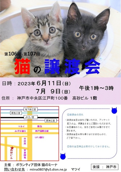 | イベント内容 | 保護された猫たちが参加して、新しいお家を求めて参加します(=^・^=) 猫は後日こちらからお届けをさせて頂き、お家の環境を見せて頂ければと思います。 猫は20年くらい生きる子もいますので、ご自身の年齢に合った猫さんとの出会いを探しに来てください。 ペット不可にお住まいの方はご遠慮ください!(ご確認してください。) 譲渡には条件が多数ありますので、ご理解くださいませ<m(__)m>。 まずはお試しで猫との相性を見てから、正式譲渡となります。 また、猫を保護して里親を探そうと思われている方も、〖参加猫の募集〗をしていますので、お申し込みくださいね! アドレス miina0807@y5.dion.ne.jp にご連絡をください。 お越しの際は各路線の三宮駅からは徒歩10分くらい、車でお越しの場合は近隣のコインパーキングなどにお停めください。 当日、体調の悪い方、発熱がある方、このような方はご遠慮ください。 毎月譲渡会を開催しておりますので、次回の出会いに期待をしてくださいね。 ブログ: 猫のミーナといっしょ http://miina300.blog.fc2.com/ ねこのオカン https://ameblo.jp/miina300/ |