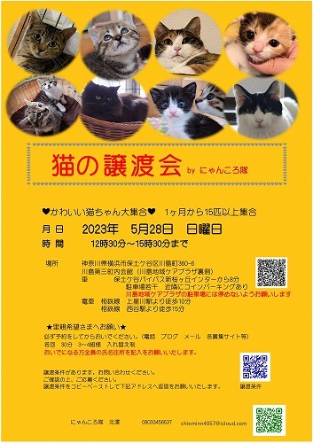 | イベント内容 | 猫ちゃんの譲渡会を開催いたします。 1ヶ月位からの猫さん15匹位参加します。 月 日 2023年5月28日 日曜日 時 間 12時30分~15時30分まで 場所 神奈川県横浜市保土ケ谷区川島町360-6 川島第三町内会館(川島地域ケアプラザ裏側) 車 保土ケ谷バイパス新桜ヶ丘インターから8分 駐車場5~6台可 近隣にコインパーキングあり (川島地域ケアプラザの駐車場には停めないでください) 電車 相鉄線 上星川駅より徒歩10分 相鉄線 西谷駅より徒歩15分 ★里親希望さまへお願い★ 必ず予約をしてからおいでください。 各回 30分 3~4組様 全員の氏名住所を記入をお願いいたします。 譲渡条件があります。お問い合わせください。 ご確認の上、ご応募ください。 猫の譲渡について http://nyankorotai.blog.fc2.com/blog-category-5.html 上記の譲渡条件をコピーペーストして下記アドレスへ送ってください。 追ってご連絡いたします。 お電話にても受付いたします。 ご連絡お待ちしております。 担当 北澤 chieminn4057@icloud.com 08033456637 にゃんころ隊 http://nyankorotai.blog.fc2.com/ |