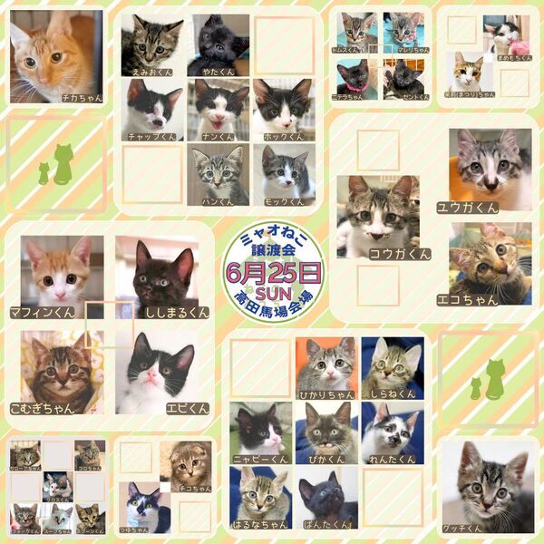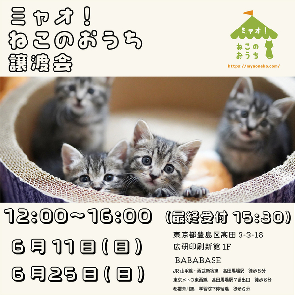 | イベント内容 | 参加する保護猫ちゃんについては、譲渡会一週間程前からホームページにてご確認いただけます。 https://myaoneko.com/catS/ 事前予約はできません。 猫ちゃんをお世話することになるご家族皆様でお越しくださると嬉しいです。 譲渡会場でお会いしましょう♪ 【新型コロナウイルス対策について】 会場受付にて、以下の点をお願いする予定です。 ✿マスクの着用 ✿検温と消毒 ✿連絡先のご記入 御来場者多数の場合には入場制限を設けさせていただきます。 ※当日沢山のご来場者様がいらっしゃった場合、整理券をお渡しする事がございます。 会場内外で長時間お待たせする場合もございますが、ご理解くださいますようお願い致します。 結果のご連絡は、当日夜〜翌日夜までの間に、お電話もしくはメールにて保護主より直接ご連絡いたします。 ◇譲渡に関してのお願い 【ミャオ!ねこのおうち】では譲渡に際して、以下の要件をお願いしております。 ・完全室内飼いで終生愛育 ・脱走させないための対策 ・不妊去勢手術 ・譲渡誓約書の取り交わし ・医療費の一部ご負担 ※60才以上の方のみのご家庭、独身や、経済的に困難な世帯、 必要な脱走対策を施していただけない方には原則的に譲渡はご遠慮頂いております。 また、保護主により譲渡条件が異なる場合もございますので会場でご相談ください。 参加予定ねこちゃんは、急な体調不良などで不参加になる場合もございます。 【譲渡に関してのお願い】・【医療費の一部のご負担】・【譲渡までの流れ】など 詳しくは下記ホームページをご覧くださいますよう宜しくお願い致します。 ミャオ!ねこのおうち ホームページ https://myaoneko.com |
