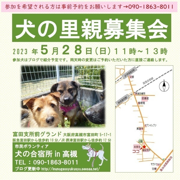 | イベント内容 | ※屋外会場での里親募集会です。 ※先住ワンちゃんを連れて会いに来て頂けます。相性を見るためにも、是非是非、連れてきてください。 ※参加犬については、今後新しい犬が数頭加わる予定です。近づきましたら「犬の合宿所in高槻」のブログで参加犬情報を紹介していきます。 → http://inunogassyukusyo.seesaa.net/ ※じっくりと犬と関わって頂きたいと思いますので、ご来場予定の方は事前にご予約をお願いいたします。 【予約・問合せ】 090-1863-8011 ・・・・・・・・・・ 【アクセス】 ・阪急京都線 富田駅から徒歩約10分 ・JR京都線 摂津富田駅から徒歩約12分 ※会場の広場の中に駐車して頂けますので、車で来場される方は事前にご連絡ください。 隣接する富田支所と公民館の駐車場は使えません。 ・・・・・・・・・・ 市民ボランティア「犬の合宿所in高槻」は、殺処分数の多い地方の保健所収容犬を引き取り、関西で新しい飼い主探しをしています。 保護犬を飼うことが文化として定着することで生体販売に伴う悲惨な繁殖犬の存在がなくなることと、 地方の収容犬を人口の多い地域で引き受けることで全体として処分数が減ることを目指しています。 ・・・・・・・・・・・・・・・・・・・・・・・・・・・・・ ★ 一時預かりさんや犬の搬送ボランティアさん、里親募集会の当日お手伝いの方など常時募集しています。 ★犬によっては個別お見合いできる場合があります。 里親募集会に参加できない方で個別お見合いをご希望の方は、預かりさんとの日程調整が必要ですので、電話でお問合せください。⇒090-1863-8011 |