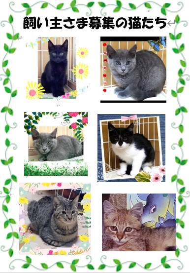 | イベント内容 | 新しい飼い主さまとの出会いを、待ち望んでいる猫たちの譲渡会です。 猫を家族に迎えたいとお思いの方、ペットショップへ行く前に、 ぜひ、この子たちに温かい手をさしのべてください。 ● 駆虫、ワクチン接種、月齢により不妊去勢済 ● 開催時間 9時半~11時 ● 開催場所:コラビア(大府市民活動センター) 国道155号森岡公民館北交差点 ℡0562-44-8500 参加猫の紹介、譲渡の条件、開催場所の地図 等 詳しくは HP(http://obuneko.sakura.ne.jp/ 飼い主さま募集中の猫たち)をご覧ください。 当日、ご都合が悪い場合は個別にお見合いしていただけますので、お問い合わせください。 |