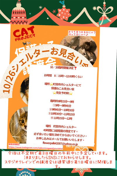 | イベント内容 | 第3日曜日は完全予約制となるのですが 町田市内のシェルターにてお見合い会をしたいなと 思います。 ⭐️完全予約制⭐️ お時間 9時〜13時くらい 9:15分〜 10時〜 10:15分〜 11時〜 11:15分〜 12時〜 場所 町田市内シェルター 45分に1組程度の限定です。 必ず会いたい猫を決めてからおいでください。 お申し込みはメールでお願いいたします。 flowerpallet2007@yahoo.co.jp 詳しい情報はInstagramまたは下記ブログにてご案内します。お気軽にお問い合わせください。 flowerpallet2007@yahoo.co.jp ameblo http://ameblo.jp/happycats2015 譲渡会情報は https://www.instagram.com/nekoniongaesijyoutokai |