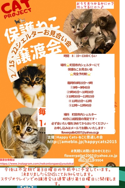 | イベント内容 | 第3日曜日は完全予約制となるのですが 町田市内のシェルターにてお見合い会をしたいなと 思います。 ⭐️完全予約制⭐️ お時間 9時〜13時くらい 9:00分〜9:45 9:45時〜10:30 10:30分〜11:15 11:15〜12:00 12時〜12:45 場所 町田市内シェルター 45分に1組程度の限定です。 必ず会いたい猫を決めてからおいでください。 お申し込みはメールでお願いいたします。 flowerpallet2007@yahoo.co.jp 詳しい情報はInstagramまたは下記ブログにてご案内します。お気軽にお問い合わせください。 flowerpallet2007@yahoo.co.jp ameblo http://ameblo.jp/happycats2015 譲渡会情報は https://www.instagram.com/nekoniongaesijyoutokai |