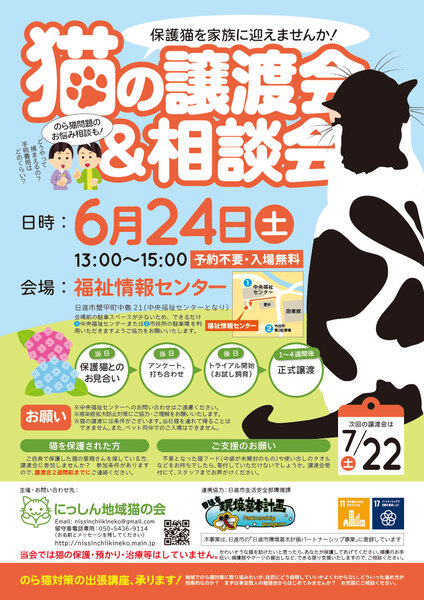 | イベント内容 | 6月24日(土)に「猫の譲渡会&相談会」を開催いたします。 猫少なめのミニ譲渡会&相談会です。 保護猫を迎えたい方はもちろん、猫に関する相談会も同時開催しておりますので、ご近所との猫トラブルなどでお悩みの方もお気軽にお立ち寄りください! 地域猫活動やペット防災についての展示もございます(^^)/ 【日時】2023年6月24日(土)13:00〜15:00 【会場】福祉情報センター(中央福祉センターとなり) 【主催】にっしん地域猫の会 【ホームページ】https://nissinchiikineko.main.jp ※重症化リスクの高い方々が多く利用される福祉センターの施設をお借りしているため、引き続き感染症拡大防止にご理解・ご協力をお願いいたします(受付名簿のご記入、室内の人数制限など)。 ※会場前に駐車場がございますが、数が少ないため、満車時は中央福祉センターの駐車場をご利用ください。図書館のむかいにある市役所の臨時駐車場もご利用いただけます。 ※室内換気のため冷房・暖房が効きにくい場合がございます。 ※ペット同伴のご入場はできませんので、予めご了承ください。 ※譲渡会に関しまして、福祉センターへのお問い合わせはご遠慮ください。 ※猫ちゃんの譲渡には条件がございます。詳細はホームページをご参照ください。 |