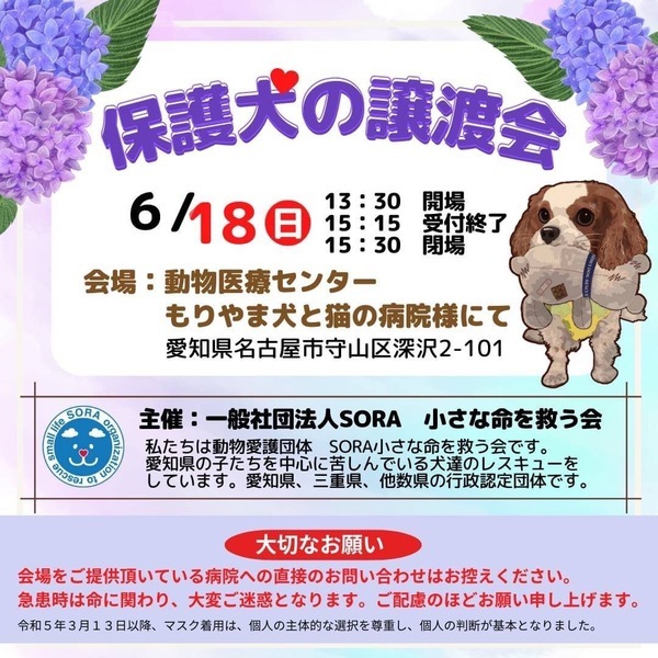 | イベント内容 | 保護犬の譲渡会を開催致します。 【注意】会場をご提供頂いている病院への直接のお問い合わせはお控えください。 急患時は命に関わり、大変ご迷惑となります。 ご配慮のほどお願い申し上げます。 もりやま犬と猫の病院さま 2階会議室 〒463-0811 名古屋市守山区深沢2-101 《ご注意》 家族希望ワンコがいる場合のお見合いに限定させていただきます。 事前のお申込みは不要です。保護活動ブログで、開催日の数日前に譲渡会参加が決定したワンコたちのご案内もしておりますので、ご希望のワンコの参加をご確認してお越し頂けますと幸いです。 なお、新型コロナウィルス感染拡大の状況におきまして、中止させていただくこともございますのでご了承下さい。 SORA公式ホームページ https://sora-chiisana.org/foster/ SORA公式活動メインブログ https://ameblo.jp/sora-chiisana-inochi/ SORAイベントブログ https://ameblo.jp/sora-charity-events/ |