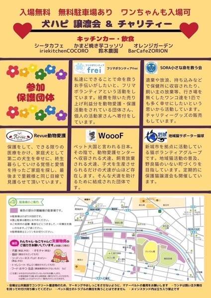 | イベント内容 | 愛知県の一般社団法人SORA小さな命を救う会です。 保護犬のお見合い会やマルシェでのチャリティイベントに参加致します。 チャリティーイベントでの収益は、全て保護犬の医療など保護活動使わせていただきます。 お出かけに気持ちいい季節です。 是非、ご家族みなさんで遊びにいらしてくださいね。 |
