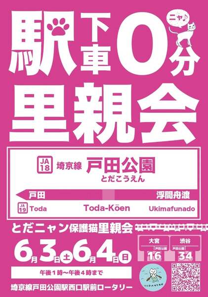 | イベント内容 | とだニャン保護猫里親会のご案内です。 日程 6/3(土)PM13:00~PM16:00まで 6/4(日)PM13:00~PM16:00まで 場所 JR埼京線 戸田公園駅コンコース 改札出てすぐ右側 子猫の詳しい画像はブログをご覧ください。 ここ↓ https://ameblo.jp/sakutotaro203/entry-12804849670.html 子猫の場合はトライアルはありませんが成猫の場合はトライアルあります。 遠方の方は希望しておりません。 戸田市を起点として高速使わない1時間以内の方を希望します。 譲渡決定となった場合、車を停めるところをご案内して頂きます。 *ご支援のお願い ●フードなんでもOK。開封済OK。賞味期限内でお願いします。 ●トイレシート(レギュラー薄型)とトイレチップをお願いします。 ●トイレシート(レギュラー)(ワイド)出来れば薄型200枚入り ●アイリスオーヤマシステム猫トイレ用消臭シート 募金箱設置します。募金のご協力をお願いします。 予約制ではありません。 見るだけでも構いません。是非足を運んでみて下さい。 どうぞよろしくお願いいたします。 |