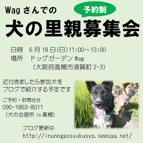 | 開催場所 | 高槻市須賀町2-3 ドッグガーデンワグ店内 | ||