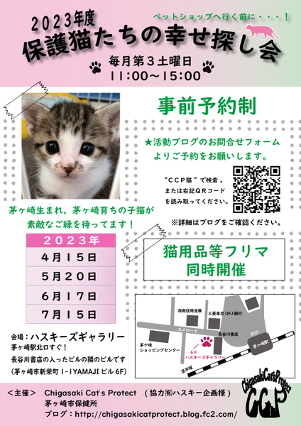 | イベント内容 | 茅ヶ崎産まれ、茅ヶ崎育ちの猫たちが新しい家族とのご縁を待っています。 詳しくは活動ブログをご確認ください。 http://chigasakicatprotect.blog.fc2.com/blog-entry-2127.html 感染症予防のため、 予めメールにてアンケートを送っていただき ご予約を取っていただくという流れを取っております。 万が一のことがあってはいけないので ご面倒をおかけいたしますが どの子にするか決まっていない方も 予めアンケートを添えてご予約のお問合せをお願い致します。 譲渡条件をご確認のうえ、 ご理解いただけた場合のみアンケートを添えてメールを送ってください。 ※先住猫さんが居る場合は必ず 今年分のワクチン接種済みである事、エイズ・白血病陰性である事、 健康診断の実施をして体調に問題が無いかを確認をしてください。 また、猫コロナ抗体価検査を実施していただきますようお願い致します。 猫コロナ抗体価実施についてはこちらの記事をご覧ください。 http://chigasakicatprotect.blog.fc2.com/blog-entry-2350.html 予約時間は11時~15時までの間で ①11時~2枠 ②12時~2枠 ③13時~2枠 ①~③までの時間帯でのご予約をお願い致します。 それぞれ1時間しっかり見ていただける時間がございますので 里親希望者様はお問合せフォームから事前予約をしたうえでご希望の時間をご記入の上、 指定時間にご来場ください♪ ※アンケートを添えてお問合せをお願い致します※ ※事前予約の無い方は譲渡会スペースへ入場できません。ご了承ください。(物販購入は可能です) ※マスク必須(マスクをお持ちでない方は当会にて販売している手作りマスクを購入していただきます) ※入場時、CCP里親希望者用アンケートへのご記入にご協力ください ◆当日猫用品等のフリマも同時開催!! |