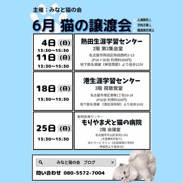 | イベント内容 | 【ペットショップへ行く前にぜひ譲渡会へ】 名古屋市の登録ボランティアであり、多数の名古屋市動物愛護推進員が在籍中です 猫や譲渡についての質問にはベテランの愛護推進員がお答えいたします<(_ _)> ●会場は ・駐車場有(利用料300円) ・予約不要&入場無料 ●参加猫は ・子猫も成猫も全頭ワクチン接種済 ・ノミダニ駆除済 ・トイレ躾済 ・ケージレストのトレーニング済 ●参加する猫たちについて 基本治療やトイレのしつけは済んでいます 足りないのは共に生きる新しい家族だけです 「譲渡会は行ったことがなくて不安…」 「猫を飼うのははじめて」 「今すぐじゃないけどいずれ猫と暮らしたい」 そんな皆様も大歓迎! ●譲渡に関して ※完全室内飼い・誓約書・治療費負担等の 諸条件があります。 ※譲渡やトライアルに関する契約条件は 猫の保護主によって異なります。 ●譲渡会その他についての問い合わせは みなと猫の会 minatonekonokai@gmail.com までお願いします。 ♪参加猫ちょこっと紹介 写真2枚目 シロミケ♀ 2ヶ月 人が好きすぎる超甘えっこです その他参加猫など詳しくは主催者ブログ ・みなと猫の会 ~こぴっと猫だより~ http://minatoneko2014.blog.fc2.com/ |