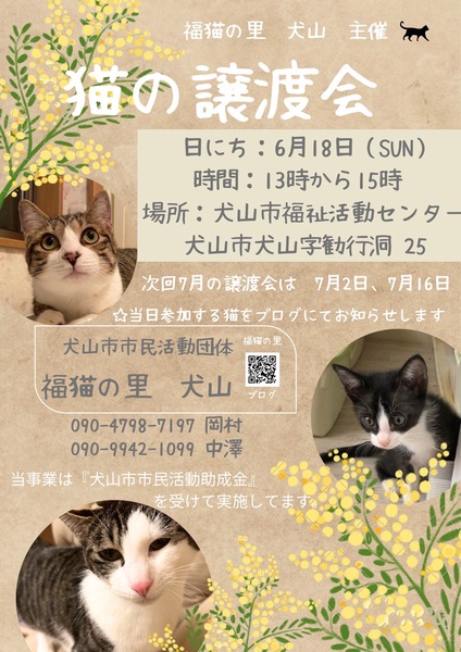 | イベント内容 | 【ココがポイント!】 ★ウイルスチェックなど健康診断済み! 20匹ほど参加予定です。 【日時】 6月18日(日)13~15時 【場所】 犬山市福祉活動センター (犬山市犬山字勧行洞25) 予約不要 広々駐車場あり 福猫の里 犬山「福猫の里便り」 https://hukunekonosato.hatenablog.com/ 問い合わせ先(福猫の里 犬山) a-saoka.922@outlook.com ーーーーーーーーー 【お約束】 当日、会場での猫の引き渡しはしておりません。 後日ご自宅までお届けします。 お試し飼育(トライアル)を1週間して頂き、双方が納得の上で正式譲渡となります。 譲渡の際は、医療費の一部の負担をお願いしております。(ワクチン代 等) ・ペット可のお住まい ・完全室内飼育、終生飼育 ・適切な医療措置 ・不妊手術の実施と報告等、お約束があります。 |