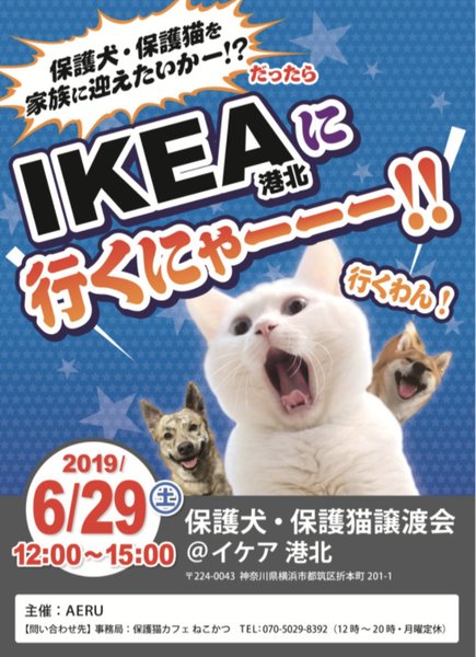 | イベント内容 | 可愛い仔犬や仔猫、成猫がたくさん出場しますよ! 当日にはご来場できないかたも、ぜひお問い合わせください。 別日にお見合いの設定も可能です。 どうぞ、よろしくお願いします。 ☆★☆★☆★☆★☆★☆★☆★☆★☆★☆★☆★☆★☆★☆★☆★☆★☆★☆★☆ ~6月29日(日)港北にて里親会開催!~ ◎場所・・「IKEA 港北」 神奈川県横浜市都筑区折本町201ー1 横浜市営地下鉄ブルーライン「仲町台」駅より約1.4km 新横浜駅などよりシャトルバスの運行あります ◎日程・・6月29日(日)(天候により中止の可能性あり) ◎時間・・12時から15時 (会場に利用可能な無料駐車場がございます。そちらをご利用くださいませ。) ■里親ご希望の方にはアンケートを記入して頂きます。 ■下記リンクより事前にアンケートをご記入いただくと、待ち時間が短縮されます。 ★ 猫ご希望のかた向けアンケート https://goo.gl/ZNRFtI ★ 犬ご希望のかた向けアンケート https://goo.gl/pwWUMj ■アンケートで頂戴した個人情報は適切に管理し、里親さま決定のための資料としてのみ使用いたします。 ■アンケートをご提出いただいても、譲渡をお約束するものではないことをご承知置きください。 ※参加予定の猫は体調により参加できない場合があります。ご了承ください。 ※詳細はお問い合わせいただくか、ブログ・HPをご覧くださいませ。 おーあみ避難所ブログ:http://ameblo.jp/oami-hinanjyo おーあみ避難所HP:http://www.geocities.jp/oami_hinanjyo/ ☆★☆★☆★☆★☆★☆★☆★☆★☆★☆★☆★☆★☆★☆★☆★☆★☆★☆★☆ |