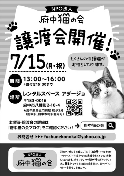 | イベント内容 | ♠︎7月15日(祝日、月曜日) ♠︎13時〜16時(15時30分まで受付) ♠︎会場はレンタルスペース アダージョ ・京王線 【府中駅】から徒歩約15分 ・JR武蔵野線、南武線【府中本町】から徒歩約15分 ・京王線【府中競馬正門前駅】から徒歩2分 ※府中競馬正門前駅は、東府中駅で乗り換え ※直接会場へのご連絡はお控えください。 ※パーキングはありません。 ――――――――――――――――――――――――――――― 参加頭数は、約20匹未満を予定しております。 今回の譲渡会には、かわいい子猫が多数!参加予定です! 一歳未満のヤングチームから成猫チームも参加します! 子猫以外は、全匹、避妊去勢手術を終えた、お留守番可能な子達しか参加いたしませんので、お仕事をお持ちのご家庭でも全く問題ありません。 トイレ訓練も、全匹OKです。ある程度の家庭猫訓練をしてからの出場となります。 ♠︎60歳以上のお方は、後継人様とご来場くださるのをオススメいたします。 ♠︎小さなお子様がいらっしゃるご家庭は、お子様の猫アレルギー検査をしてからお越しください。 ♠︎おひとり暮らしの方も、後継人を明確になさってからお越しください。 ♠︎子猫をご希望の方は、日中ご自宅にいられる方限定でお願いします(パートタイマーなどの方はご相談ください) お子さんOK!の子達や、猫飼い初心者OK!の子達から、ツンデレ(笑)の子達など、みんな十猫十色です。 様々なキャラの子達が、出場しますので、1匹づつの詳しい情報はブログ記事にてご紹介させていただきます。 みんな、どの子もかわいい子達ばかりですので、自信を持ってご紹介させていただきます! そして、出場する子達は、みんなどの子も保護をしなければ生きてはいけなかった命ばかりです。 どうか、保護猫達の家族になってください。 たくさんのお越しを心よりお待ちしております。 ―――――――――――――――――――――――――― ※譲渡会にお越し頂いた方を優先に譲渡したいと考えております ※譲渡会は予約制ではございません。また、先着順ではなく、希望者様の中から選考とさせて頂いております 【お願い】会場への直接の問合せはお控え下さい。必要な場合は、府中猫の会へ原則mailでお願い致します。 ※猫ちゃんの体調等、最新情報はblogに掲載しますので、適宜checkをお願いします! http://ameblo.jp/team-rose-cats/ ▲応募条件 ・ペット可の住宅。 ・完全室内飼い(脱走防止に配慮いただける方) ・定期的な健康check(必要な医療処置を含む) ・終生飼育(ご高齢または単身の方は、後見人相当の方のご同意をお願いします) ・ワクチン、去勢避妊の医療費(証明書類を提示またはお渡しします)を負担いただける方 ※リクエストに応じ環境に慣れるまでの間、ケージを無償レンタルすることも可能です(数に限りがあるので、その点ご承知ください) ▲応募可能地域 埼玉県南東部、東京都、神奈川県北東部. 移動による猫の負担を考慮し、調布飛行場から40km圏内にお住まいの方 詳しくは譲渡会場にてお尋ね下さい。 ※対応をスムーズに行うため、飼育経験,ご家族構成,応募の動機など、簡単なアンケート(当日配布)にご協力ください ※当日の引渡しではなく、後日ご自宅へお届けとなります ※当日ご来場不可の方は、開催日以降にmessage機能または、mailでお問合せ下さい |