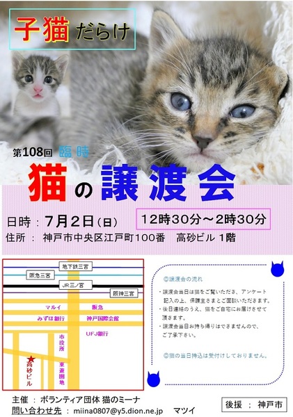 | イベント内容 | 今回は生後2カ月の仔猫だけの譲渡会です。 子猫たちが幸せになるために、新しいお家を求めて参加します(=^・^=) 子猫は後日こちらからお届けをさせて頂き、お家の環境を見せて頂ければと思います。 猫は20年くらい生きる子もいますので、ご自身の年齢に合った猫さんとの出会いを探しに来てください。 ペット不可にお住まいの方はご遠慮ください!(ご確認してください。) 譲渡には条件が多数ありますので、ご理解くださいませ<m(__)m>。 まずはお試しで猫との相性を見てから、正式譲渡となります。 また、猫を保護して里親を探そうと思われている方も、〖参加猫の募集〗をしていますので、お申し込みくださいね! アドレス miina0807@y5.dion.ne.jp にご連絡をください。 お越しの際は各路線の三宮駅からは徒歩10分くらい、車でお越しの場合は近隣のコインパーキングなどにお停めください。 当日、体調の悪い方、発熱がある方、このような方はご遠慮ください。 定例の毎月は第2日曜日に譲渡会を開催しておりますので、次回の出会いに期待をしてくださいね。 ブログ: 猫のミーナといっしょ http://miina300.blog.fc2.com/ ねこのオカン https://ameblo.jp/miina300/ |