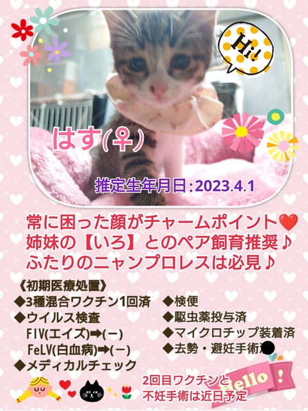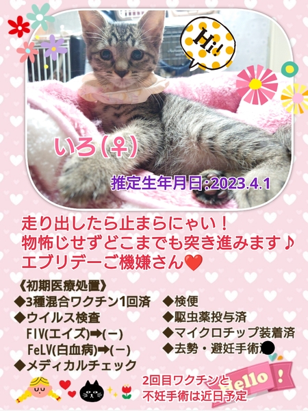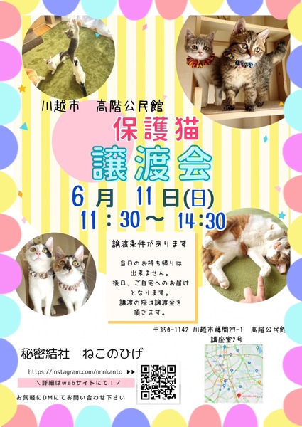 | イベント内容 | 【秘密結社ねこのひげ♡保護猫譲渡会】 6/11(日) 12:00~15:00 川越市藤間27-1 高階公民館 講座室2号内 にて開催します☆ 2023年第二弾の仔猫たちから♪ 2~3ヶ月齢のちびっ子ギャングや 1才までは子猫だにゃー!な幼猫や まだまだ若いもんにゃ負けない!な オトナ猫たちがワクテカで参加します♪ 未来のご家族さまと 愛し愛されな 両想いになれますように♡ 家族にするなら保護猫だべ♪♪ こんなご時世だけど 新しい家族と笑顔で暮らしたい♪ という方は是非会いにいらしてください♡ 新型コロナ対策として 受付名簿のご記入、消毒 マスク着用などのご協力をお願い致します。 物販の方も屋外スペースにて こじんまり置かせて頂きますので ご近所の方はふらりと是非 お立ち寄りくださいませ。 ご不明な点がございましたら インスタグラム @秘密結社ねこのひげ の DMまでお問い合わせ下さい。 |