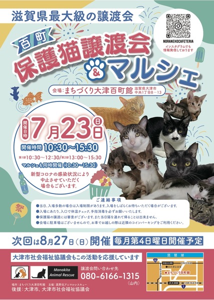 | イベント内容 | 滋賀県最大級の保護猫譲渡会。 毎回40頭以上の猫さんが参加します。 初めての方でも安心して譲渡の安心サポートの譲渡会です。 予約不要、入場無料。 参加猫さんのご紹介は https://ameblo.jp/hyakucyojyoutokai または、Instagram @hyakucyoujyotokai をご覧下さい。 後援 大津市 大津市社会福祉協議会 |