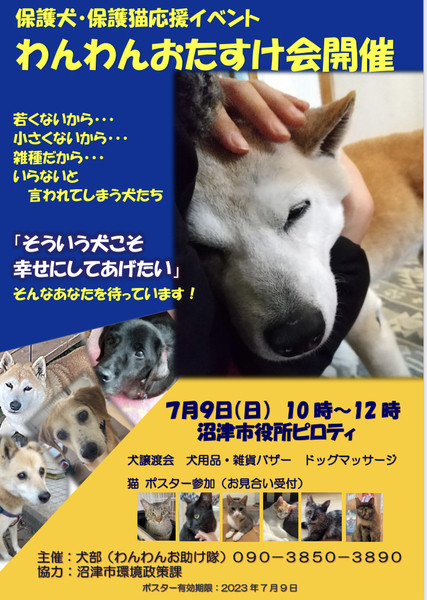 | イベント内容 | わんわんおたすけ会のお知らせです! 6月はおやすみします。 次回のわんわんおたすけ会は、 7月9日(日)10時〜12時 沼津市役所にて開催します。 大きな屋根があり涼しいところです いつもは第3日曜ですが、今回は第2日曜になります わんわんおたすけ会は保護犬譲渡会やバザー、ドッグマッサージなどのワンコ応援イベントです? バザーでお買い物をしていただくと売上の一部が寄付となります。 わんちゃん連れOKです! ご来場いただいた方にわんこの迷子札も無料でお渡ししています。 もしお時間があれば気軽に覗きに来てください? ワンコ共々お待ちしています #里親募集中犬 #里親募集中猫 #静岡県 #沼津市 #沼津市役所 #保護犬譲渡会 #犬部わんわんお助け隊 #わんわんおたすけ会 #チャリティバザー #スウェーデン式ドッグマッサージ |