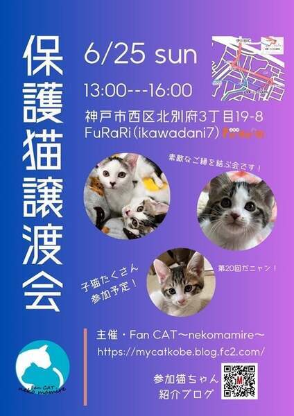 | イベント内容 | 猫の譲渡会 2023年5月25日(日)13時~16時 神戸市西区北別府3丁目19-8 https://goo.gl/maps/Cq15cEHSiWqmYVC8A Fu・Ra・Ri(ikawadani7)無料パーキングあります 子猫がたくさん参加しています! 中猫さん大人猫も参加していますので是非ご参加ください!! 参加の猫ちゃんたちはブログにて掲載しています 19日より紹介がはじまります https://mycatkobe.blog.fc2.com/ お見合いしたいと思われる方は、ブログのメールフォーム、InstagramのDMより お越しになる時間をご連絡ください ※譲渡は無料ではございません(譲渡会参加は無料です) ※譲渡条件がございます ※当日連れて帰れません ※※早い順ではございませんがご縁があれば早くに決まってしまう 場合がありますのでお見合いの予約かお早めにご来場ください 主催 Fan CAT~nekomamire~ |