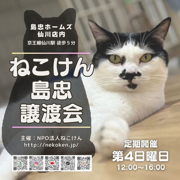 | イベント内容 | ペットとしてではなく、生涯家族として猫を迎えて下さる方への譲渡となります。 原則『譲渡会』にて正式なお申込みを承っております。 譲渡会には家族を待っている猫さん達がたくさん参加します♪ ▽▲ねこけん定期譲渡会▲▽ ★毎月第4日曜日は島忠ホームズ仙川店にて開催★ [時間] 12:00〜16:00 [会場] 島忠ホームズ仙川店 〒182-0003 東京都調布市若葉町2-1-7 https://www.shimachu.co.jp/gmshop/tokyo/313.html [交通] ・京王線「仙川駅」より徒歩約5分 ※事前のご予約は必要ございません。ご家族皆様でお越し下さい。 ※混雑時は整理券をお配りし、お待ちいただく場合がございます。 ※屋内での開催となり雨天決行です。 ※猫ちゃんたちとのふれあいはできません。 --- ◆必ずお守り頂く事◆ ①終生飼養 ②完全室内飼養 ③年1回のご報告 ④ペット飼育可能な物件にお住まいであること ただし、以下の該当の方は、譲渡出来ない場合がございます。 ※学生、安定的な収入のない方 ※60歳以上の方は、成猫さんを家族に迎え入れることが出来ます。 里親様のご年齢に応じた成猫の譲渡となりますのでご相談ください。 ◆譲渡費用について◆ 不妊去勢手術・医療費の一部負担をお願いしております。 お届けエリアによっては往復高速料金(実費)を別途ご負担いただく場合がございます。 なお、交通費に関しましては正式譲渡に至らない場合であってもご返却できませんので予めご了承下さい。 ・ご希望の猫さんと家族になるまでの流れ ・譲渡時にかかる一部ご負担金などの詳細 ・譲渡契約書のサンプル等 下記URLに掲載しておりますのでご確認ください。 https://nekoken.jp/jotokai/joto-nagare/ https://nekoken.jp/jotokai/joutokibou/ ◆引き渡し方法◆ 1週間程度のトライアルの後、正式譲渡となります。 必ずご自宅までお届けします。 ◆お届け可能エリアについて◆ 応募可能エリア内であっても、遠方の場合アフターフォローの関係上お断りさせていただくことがございます。 ご心配な際は、前もって市区町村名や最寄り駅等をメールにてお問い合わせいただけますと幸いです。 お手数をおかけいたしますが、何卒ご了承くださいますようお願いいします。 ※譲渡会日程がご予定と合わず個別お見合いご希望の方は、各募集サイトからのご応募 もしくは下記連絡先までお問い合わせください。 ※猫さんの性格や体質により譲渡会に参加することが困難な子もいます。 気になる猫さんの譲渡会への参加情報などは、個別にお問い合わせください。 [連絡先] ご質問等ございましたらお気軽にお問い合わせください。 NPO法人ねこけん東京本部 https://nekoken.jp/inquiry/ nekoken@cat.email.ne.jp [ホームページ] https://nekoken.jp [Instagram] https://www.instagram.com/nekoken2222/ [ブログ・ボラ日記・YouTubeなど] https://linktr.ee/nekoken フォロー・チャンネル登録よろしくお願いします! |